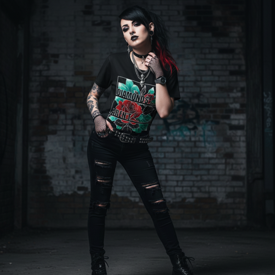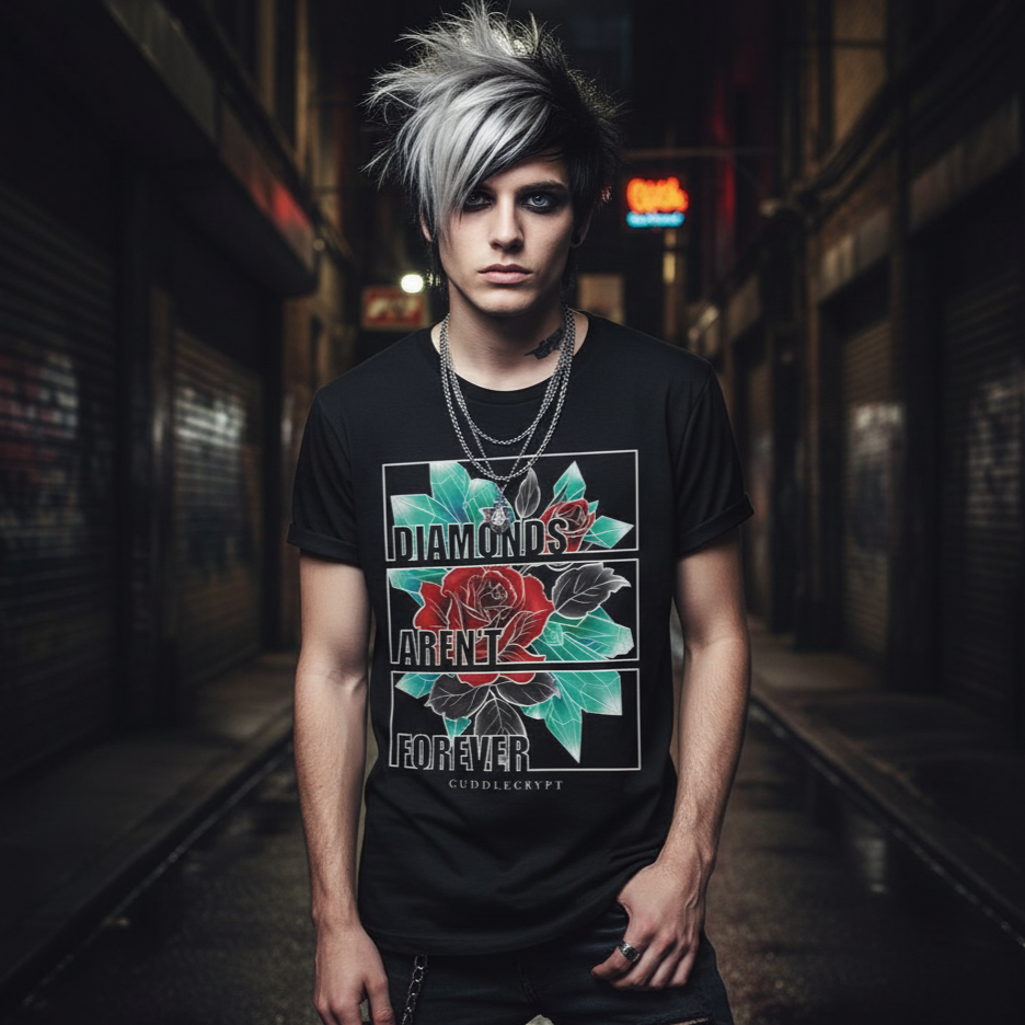 A classic fit short sleeve tee made from 100% cotton. Designed for long-lasting wear, it offers a soft hand feel with durable construction and a lightweight finish. Features a striking piece from our colored Triptych Collection printed across the front, with a red rose blooming from fractured teal crystals. A visual ode to impermanence, this design reminds us that not everything beautiful lasts—and that’s okay. Letting go is part of living, and this tee wears that truth like armor.