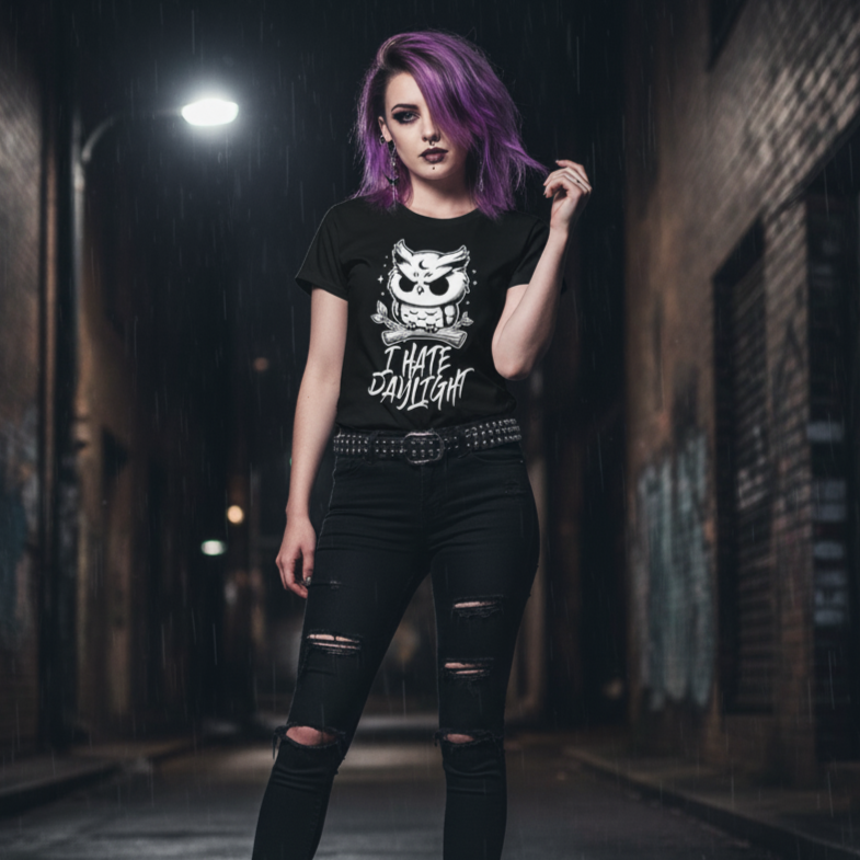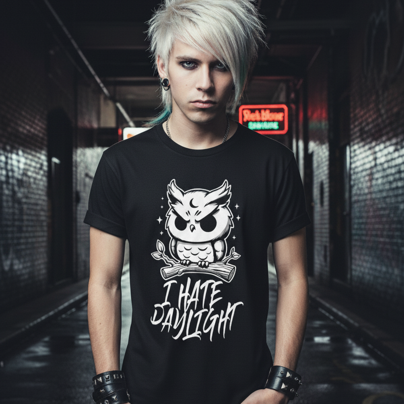 A classic fit short sleeve tee made from 100% cotton. Designed for long-lasting wear, it offers a soft hand feel with durable construction and a lightweight finish. Features a playful yet moody design from our Darklings Collection printed across the front, showing a grumpy little owl perched on a branch above the bold words “I Hate Daylight.” Made for the night owls, cave dwellers, and cozy gamer gremlins who thrive after dark—this tee says “no thanks” to the sun and yes to late-night vibes only.