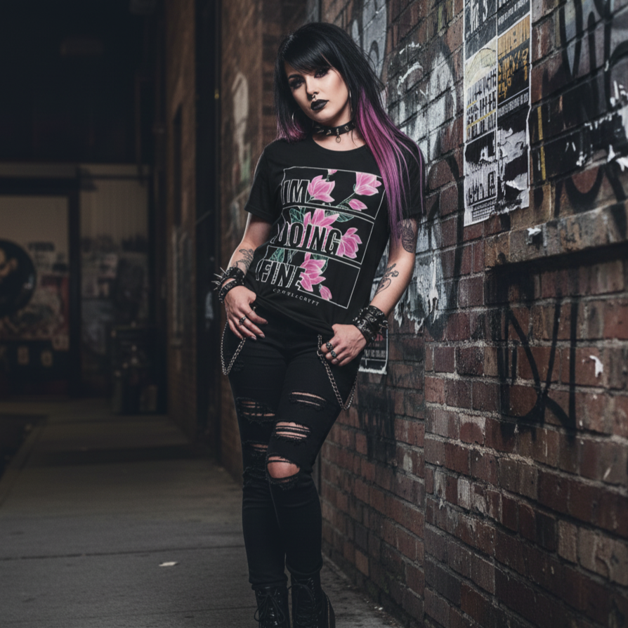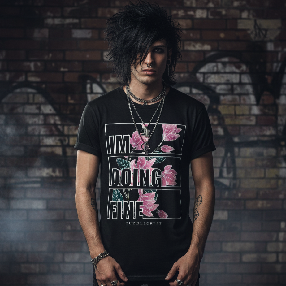 A classic fit short sleeve tee made from 100% cotton. Designed for long-lasting wear, it offers a soft hand feel with durable construction and a lightweight finish. Features a bold, 3-panel graphic from our colored Triptych Collection printed across the front, combining emo resilience with soft floral elements. With “I’m Doing Fine” front and center, this design salutes the quiet strength it takes to hold it all together. A raw reminder that surviving is still a form of thriving.