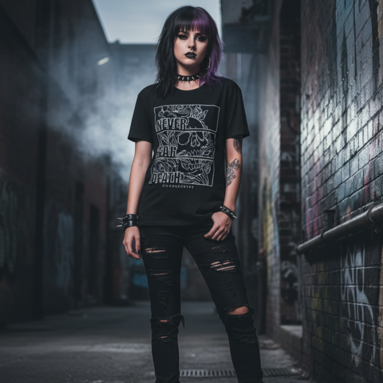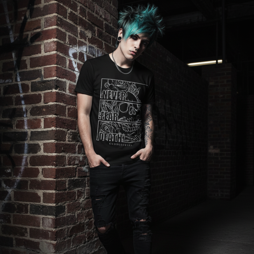 A classic fit short sleeve tee made from 100% cotton. Designed for long-lasting wear, it offers a soft hand feel with durable construction and a lightweight finish. Features a bold graphic from our black & white Triptych Collection printed across the front, showing a skull resting in a bed of roses and leaves. “Never Fear Death” isn’t just a phrase—it’s a mindset. A reminder to the quiet souls and the chaotic hearts alike: fear doesn’t stop the end, so don’t let it stop your life.