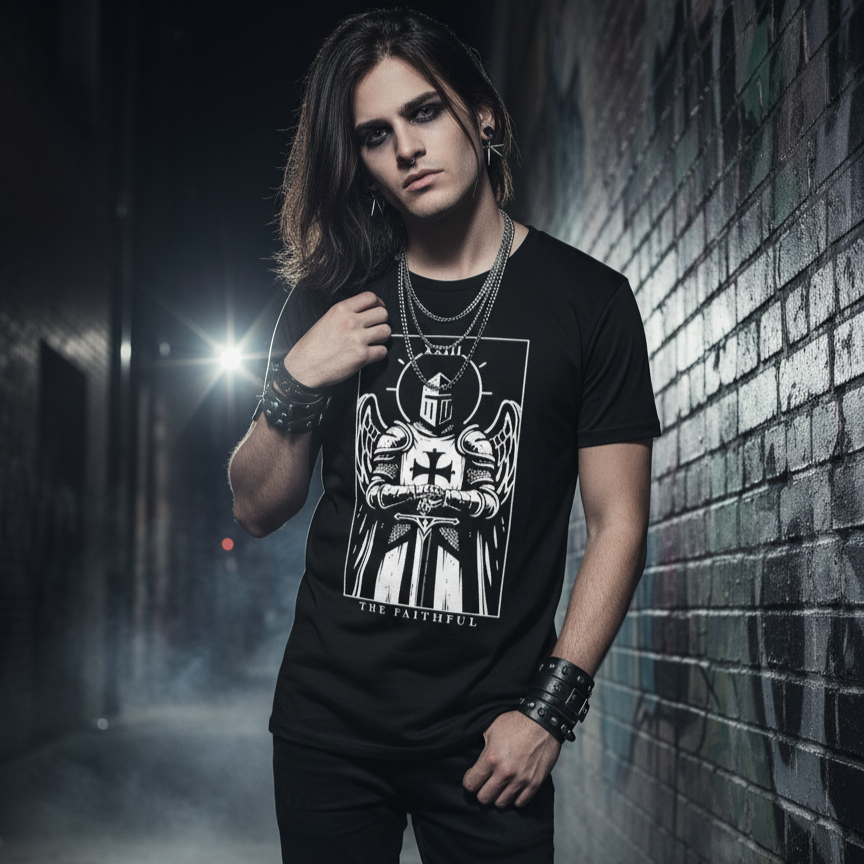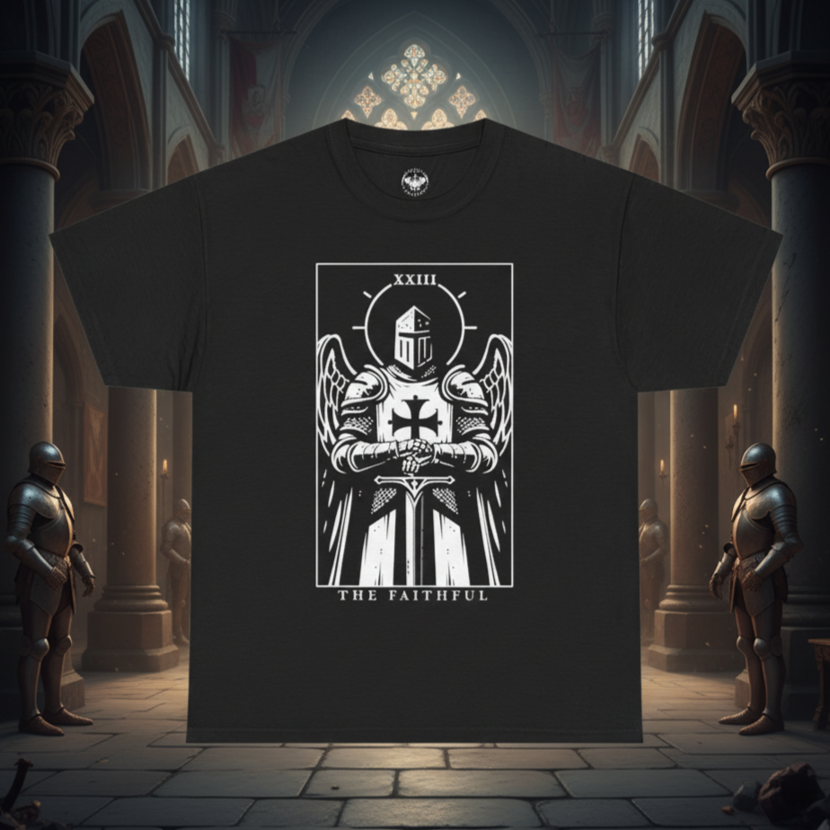 A classic fit short sleeve tee made from 100% cotton. Designed for long-lasting wear, it offers a soft hand feel with durable construction and a lightweight finish. Features a solemn and powerful design from our Tarot Collection printed across the front, styled like an ancient tarot card. “The Faithful” showcases a knight in full armor, angel wings unfurled, hands resting atop a downward sword. Marked with a cross of devotion, this piece honors the ride-or-die protectors—the ones who stand by you through the darkest nights. Loyalty. Honor. Unshakable faith and loyalty.