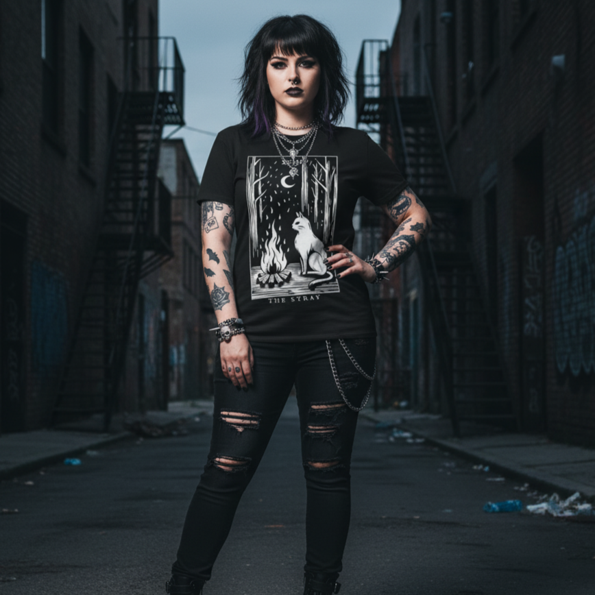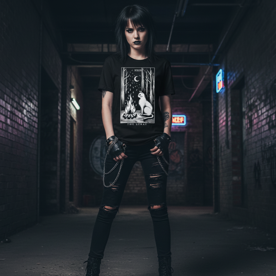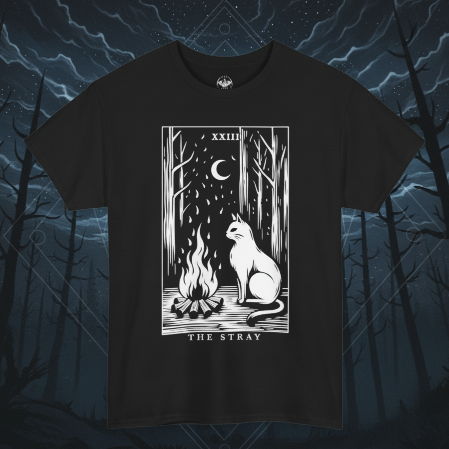 A classic fit short sleeve tee made from 100% cotton. Designed for long-lasting wear, it offers a soft hand feel with durable construction and a lightweight finish. Features a moody design from our Tarot Collection printed across the front, depicting a lone stray cat sitting near a campfire deep in the woods. “The Stray” is a quiet anthem for the self-reliant—the ones who walk their own path, survive the hard nights, and find comfort in their own company. Strength isn’t always loud. Sometimes, it’s just a purr in the silence.